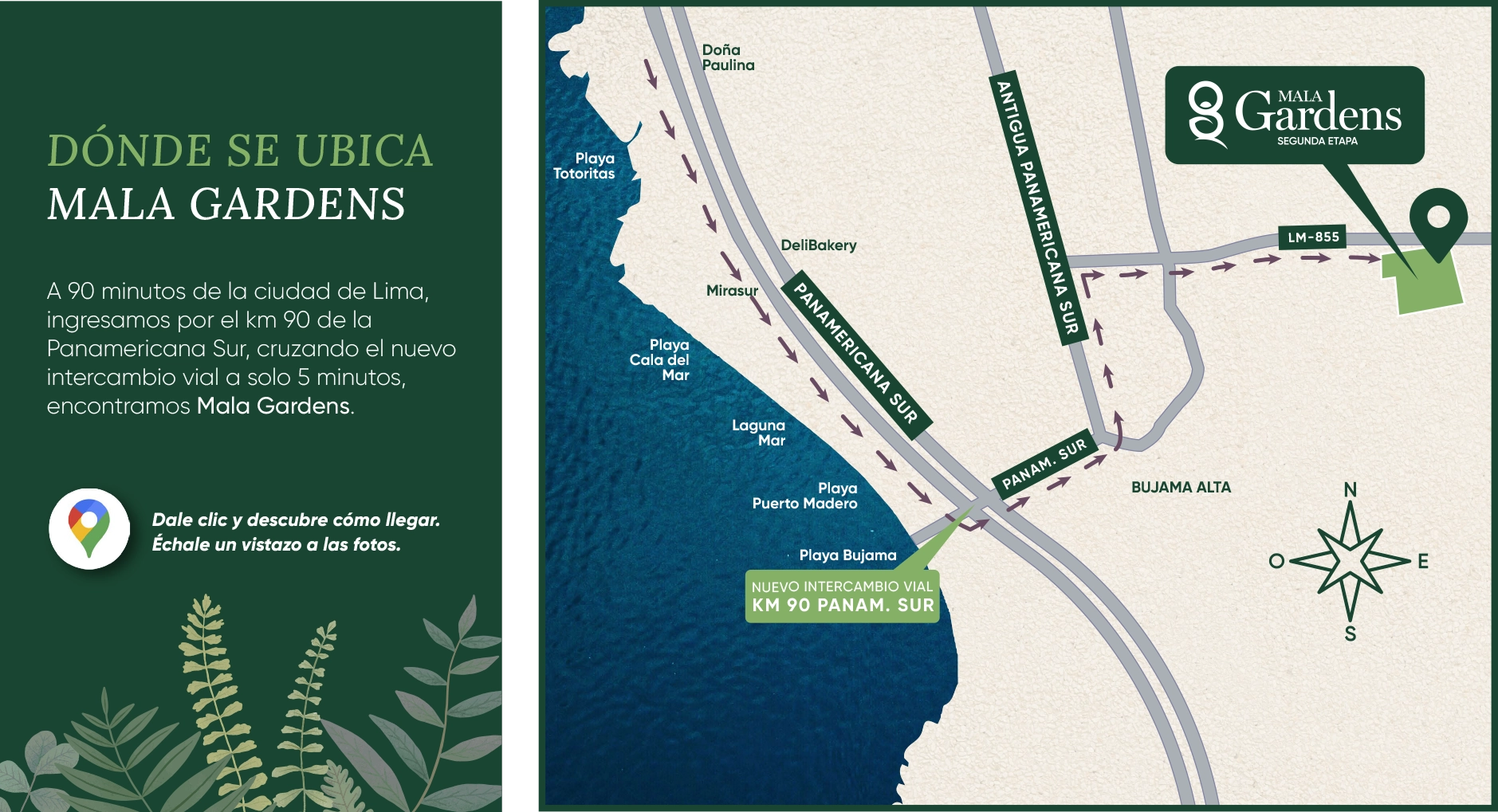 Mala Gardens se encuentra en el distrito de Mala, provincia de Cañete, Lima – Perú, a la altura del km 90 de la Panamericana Sur, una moderna autopista que permite llegar desde Lima en aproximadamente 1 hora, de forma rápida y segura.